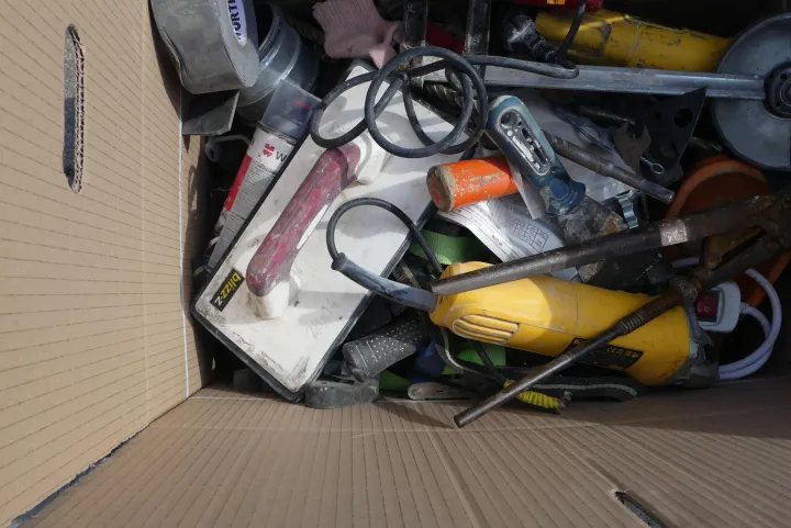 Konvolut Werkstattzubehör (Box mit Inhalt, z. B. Schraubzwinge, Klebeband, diverse Werkzeuge)