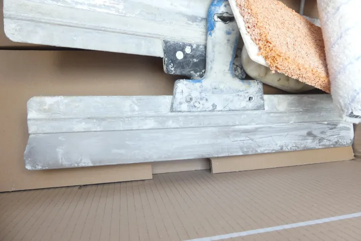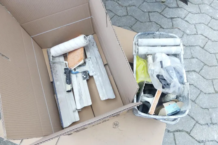 Konvolut Maurerzubehör (Box mit Inhalt, z. B. Tapezierrolle, Glättbrette)